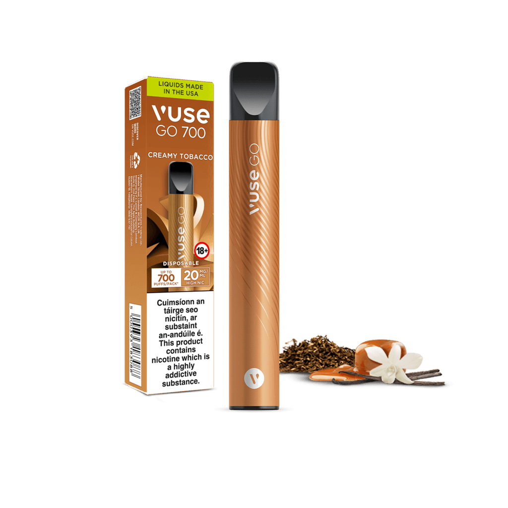 The Creamy Tobacco flavour Vuse GO 700 disposable vape comes pre-filled with 2ml of e-liquid with a balanced blend of tobacco and vanilla flavours.
