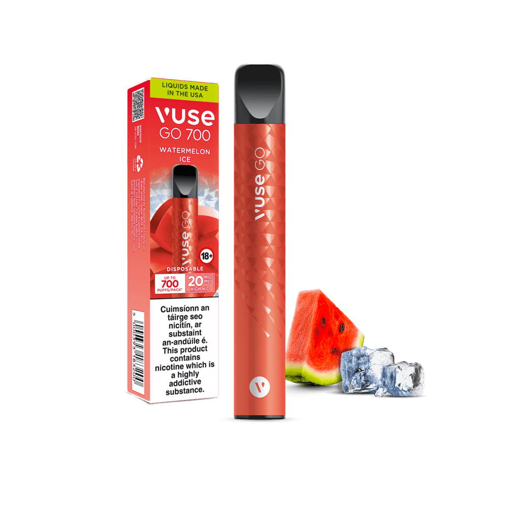 The Watermelon Ice flavour Vuse GO 700 disposable vape comes pre-filled with 2ml of e-liquid with a watermelon taste and an icy cool finish.